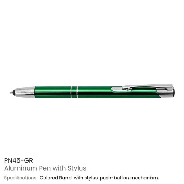 Introducing to you our aluminum pens with a stylus. It performs two different functions. It has been created with aluminum material. This multi-functional pen comprises a colorful metal barrel. This metal barrel comes in five different colors. The colors include black, green, silver, blue, and red. Apart from the barrel, it comprises a silver tip and clip. Thus, it’s a perfect branded pen for companies. The silver clip at the end of the pen works like a holder. Thus, you can attach the pen to your shirt or bag.  This stylish metal pen also comprises a stylus so you can use it on your smartphones. It comes with a push-button mechanism. So, you can easily switch between the ball pen and stylus.