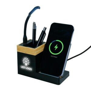 Bamboo Pen Holder with 15W Wireless Charger & LED Logo