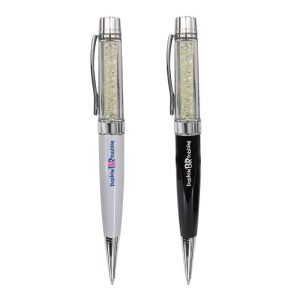 Crystal metal pens are luxurious high-quality ballpoint pens. They are created with shiny metallic material and crystals on glass. Thus, it is glossy and durable at the same time. This pen comprises a barrel. The lower part comprises glass with crystals while the upper part is black. The crystal part gives a shiny finish. Thus, making it more stylish. Apart from the barrel, it also comprises a silver tip and chrome clip. Thus, it’s a perfect promotional metal pen for business promotion. The chrome clip at the end of the pen works like a holder. Thus, you can attach the pen to your shirt or bag. There is a round logo area on the top of the pen. Thus, you can also use these promotional metal pens for events.
