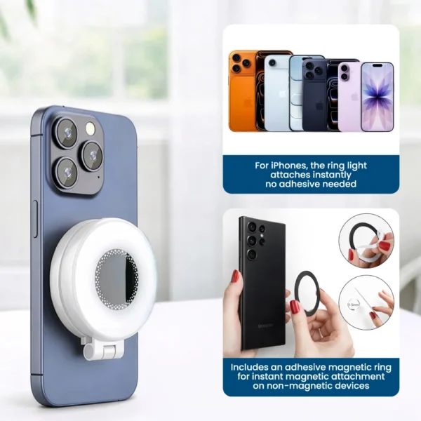 Compact MagSafe selfie ring light with cool and warm LED tones, adjustable brightness, and built-in battery—ideal for influencers, professionals, and promotional tech gifting.