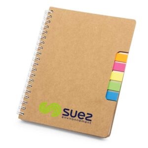Spiral notebooks with sticky notes and pens are creatively customized notebooks. The cover of this notepad had crafted from 100% recycled and durable cardboard material. Thus, they are eco-friendly and durable spiral notebooks. This spiral notebook comprises two parts. One part contains colorful sticky notes and a cardboard pen with a pen holder. While the other part has note pages. Thus, it?s an excellent creative promotional item for you for the promotion of your company or brand. So, you can use these notebooks for multiple purposes. This cover is in light brown with a white spiral ring. However, the pen has a cardboard barrel with a white tip and clip. Thus, it?s a perfect corporate gift.