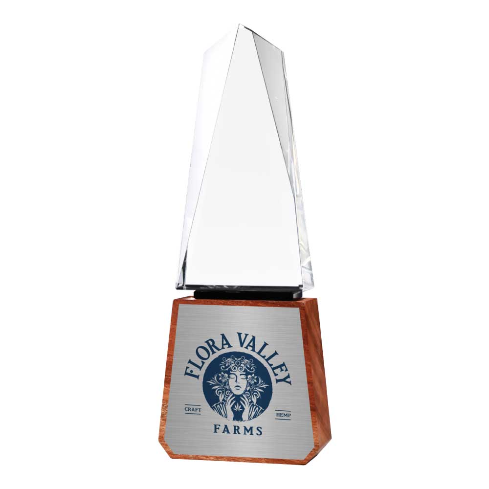 Tower-shaped crystal awards with wood base and packed in a wooden presentation box.
